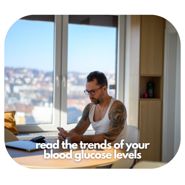 The CGM measures glucose readings continuously. You can read the trends of your blood glucose levels throughout the day and night.