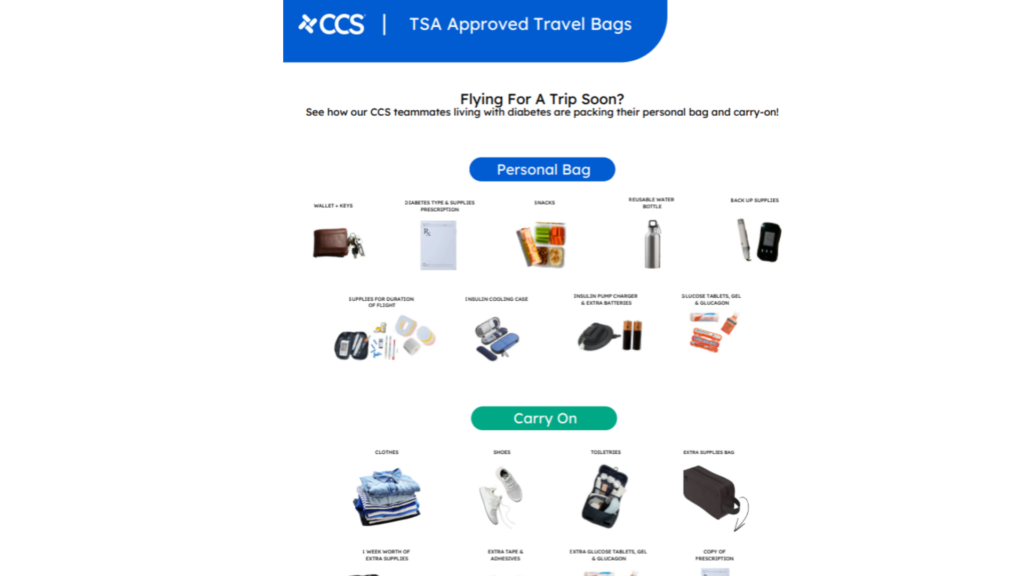 Carry a card with your emergency contact details, doctor’s name, and important medical information. You may also want to include your insulin pump settings in case of a pump malfunction or to program a back-up travel pump. This small piece of paper can make a big difference. Pro Tip: Laminate it or keep a picture of it on your phone!