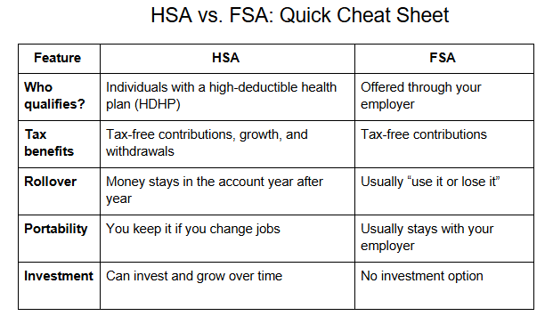Here’s a helpful chart to help you visualize the benefits and differences between HSAs and FSAs.
